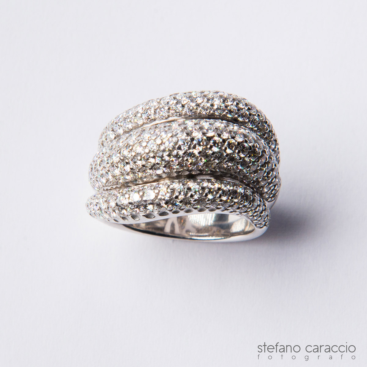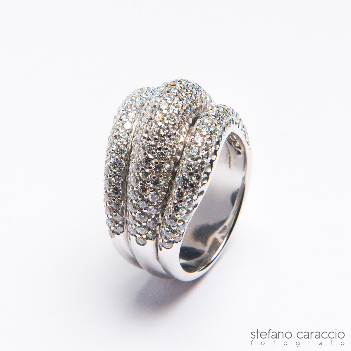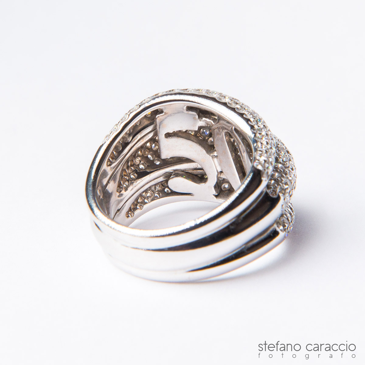 L’anello, realizzato in oro bianco 750/1000, è disposto su 3 fasce a onda. Sulle fasce sono incastonati diamanti, taglio brillante, per una caratura totale di CT. 2,50.
