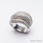 Il prezioso è realizzato in oro bianco 750/1000. La sua particolarità è che i “diamanti sono incastonati a bulino“, quasi a formare un reticolato.