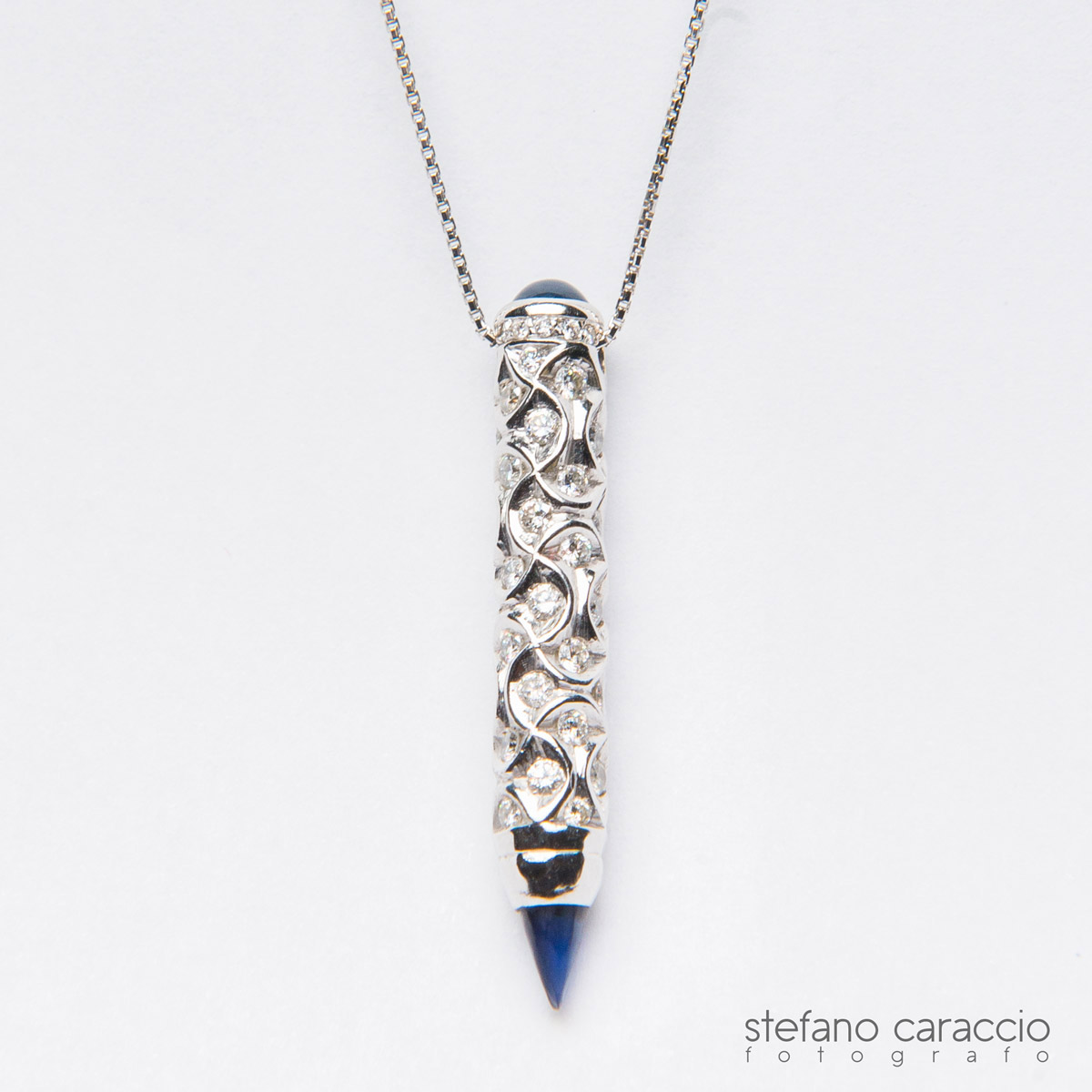 Dopo qualche giorno tornai nel suo studio e rimasi stupito dalla bozza che Domenico mi fece vedere, una meravigliosa matita finemente lavorata con diamanti incastonati e due zaffiri blu alle estremità. Gli chiesi quindi di procedere alla realizzazione del ciondolo che lasciò a bocca aperta tutti quanti, in particolar modo mia figlia che lo considerò come il simbolo di un traguardo importante con cui “scrivere le meravigliose pagine del suo futuro“.